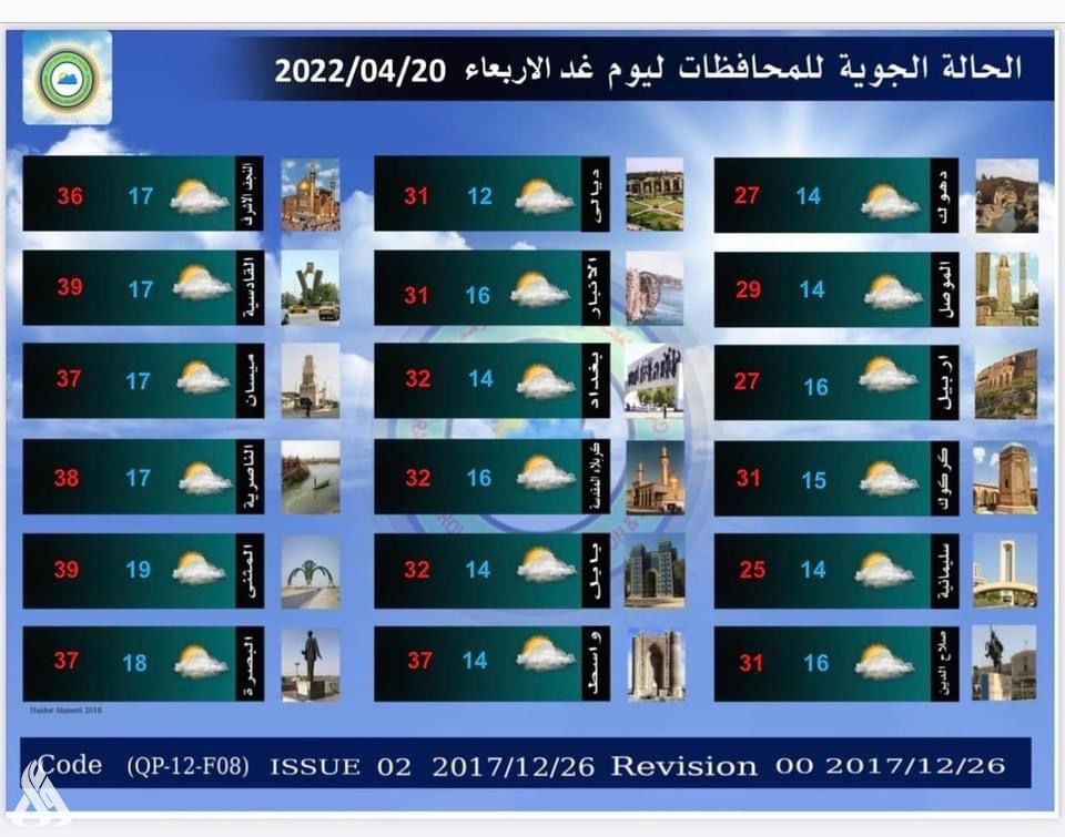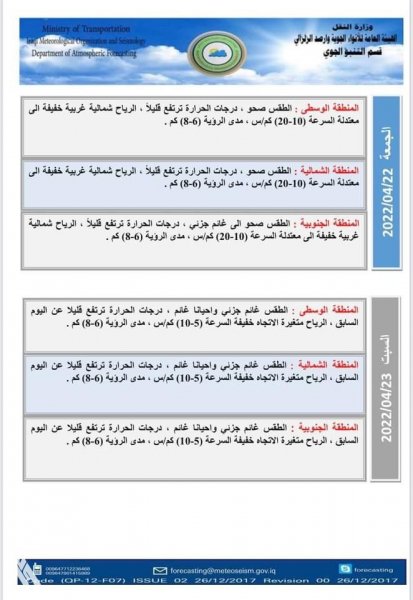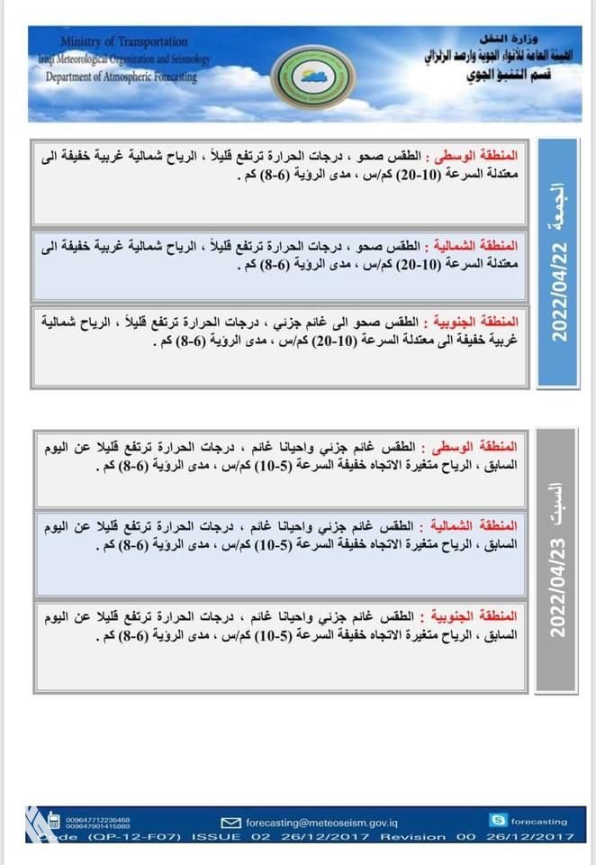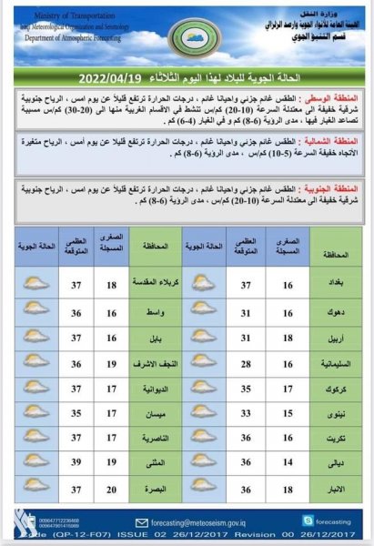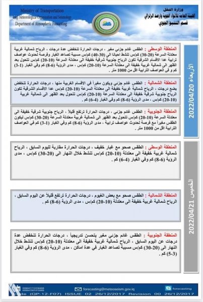 أعلنت هيئة الأنواء الجوية، اليوم الثلاثاء، عن حالة الطقس في البلاد للأيام المقبلة، فيما توقعت انخفاضاً في درجات الحرارة وحدوث عواصف ترابية غداً الأربعاء.