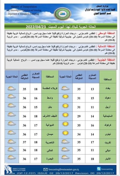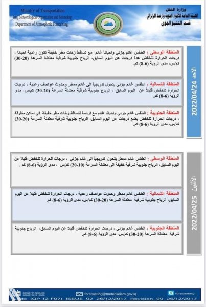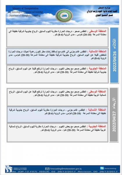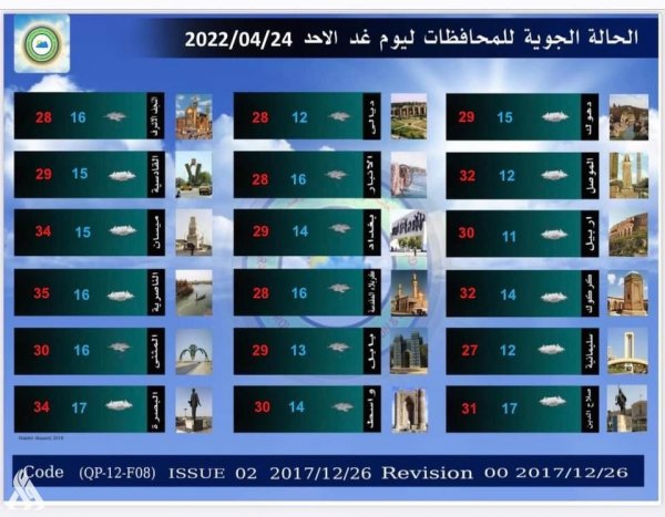 أعلنت هيئة الأنواء الجوية، اليوم السبت، عن حالة الطقس في البلاد للأيام المقبلة، فيما توقعت هطولاً للأمطار وانخفاضاً في درجات الحرارة يومي الأحد والاثنين.