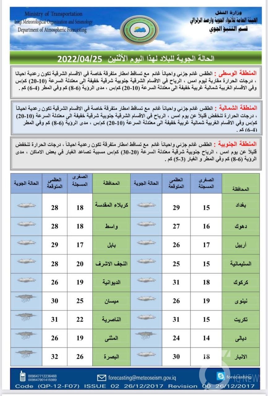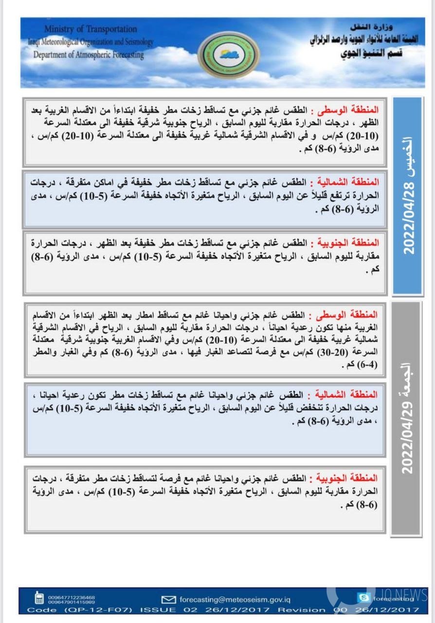 وقالت الهيئة في بيان إن "الطقس غائم جزئي إلى غائم مع تساقط أمطار في المناطق الوسطى والشمالية والجنوبية، وتكون الأمطار رعدية أحياناً ودرجات الحرارة مقاربة ليوم أمس الأحد، في المناطق الوسطى وتنخفض في المناطق الجنوبية".