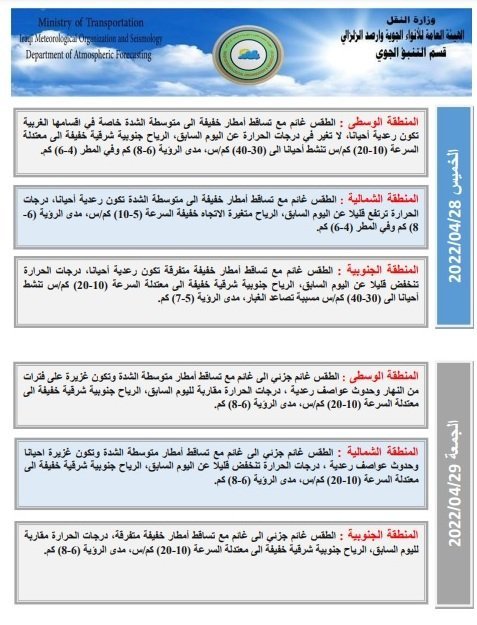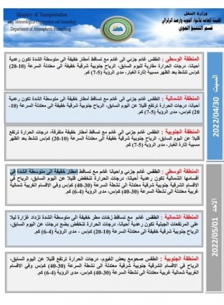 أعلنت هيئة الأنواء الجوية، اليوم الأربعاء، حالة الطقس في البلاد للأيام المقبلة، فيما توقعت تساقط أمطار رعدية حتى الأحد المقبل.