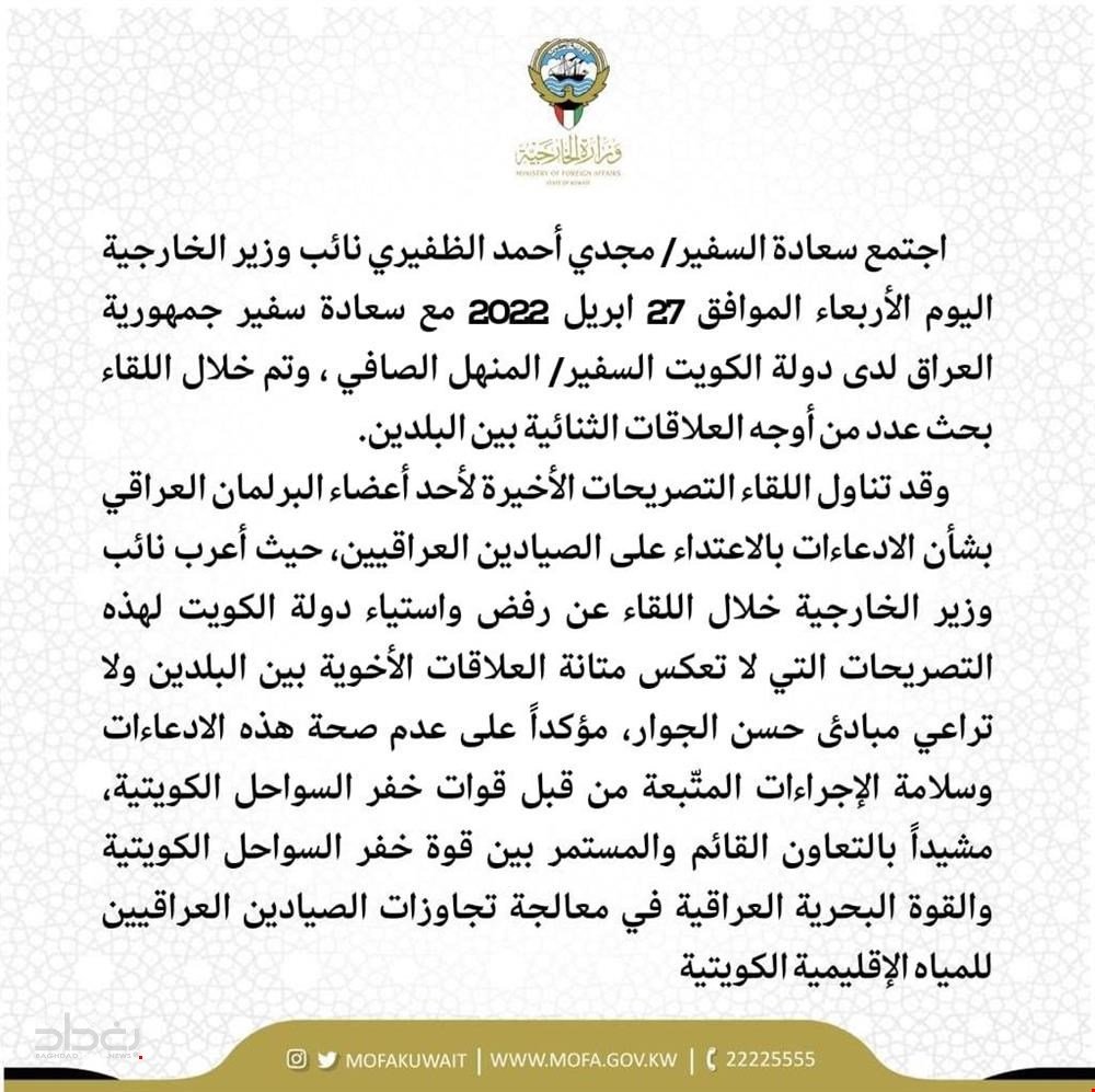 وقالت وزارة الخارجية الكويتية عبر وثيقة لصحفي إن "دولة أعربت عن رفضها لتصريح أحد النواب العراقيين بشأن التعامل مع الصيادين العراقيين".