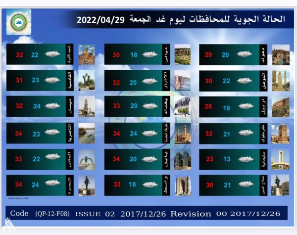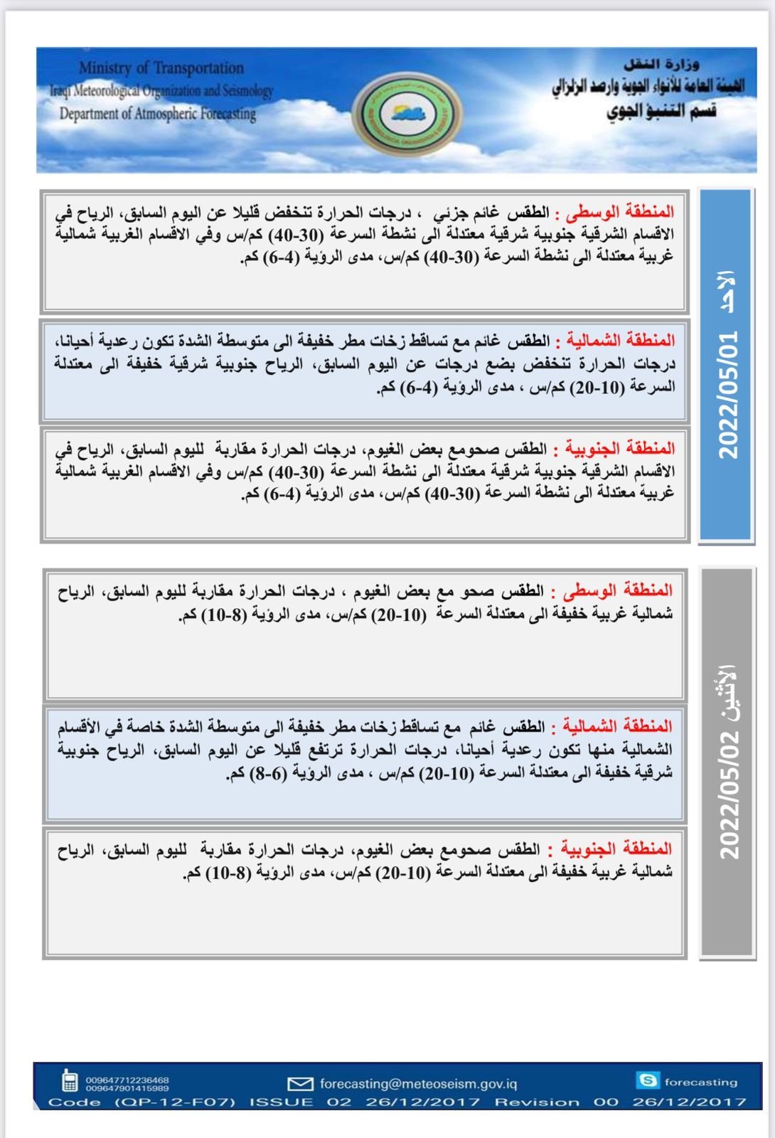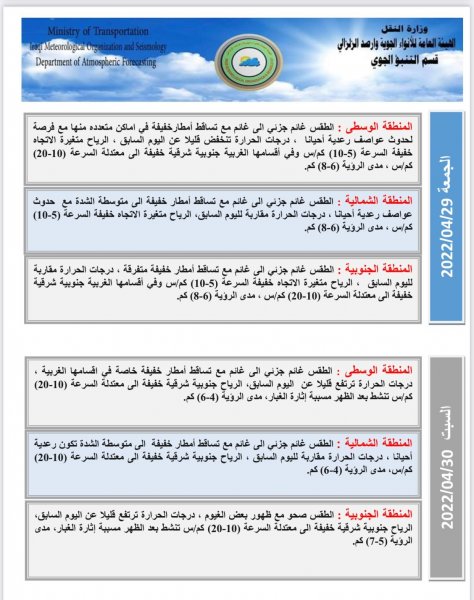 اعلنت هيئة الأنواء الجوية، اليوم الخميس، عن حالة الطقس في البلاد للأيام المقبلة، فيما توقعت حدوث عواصف رعدية وانخفاضاً في درجات الحرارة غداً.