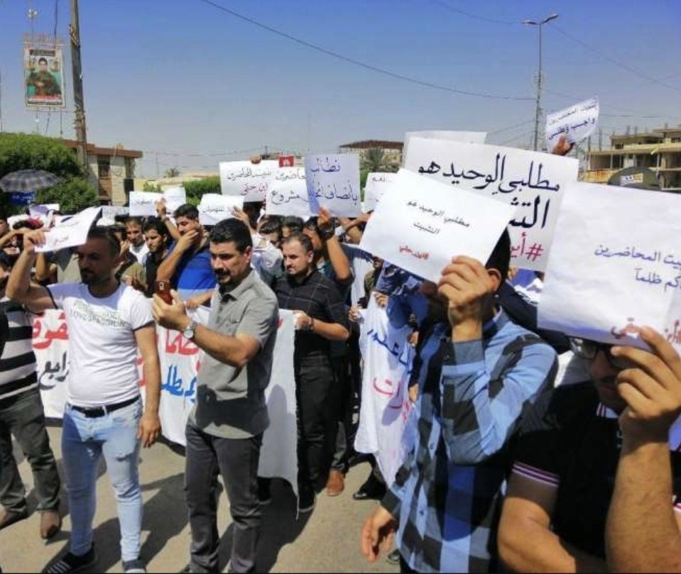 مئات الخريجين التربويين والاداريين يتظاهرون امام تربية كربلاء لشمولهم بالتعيينات