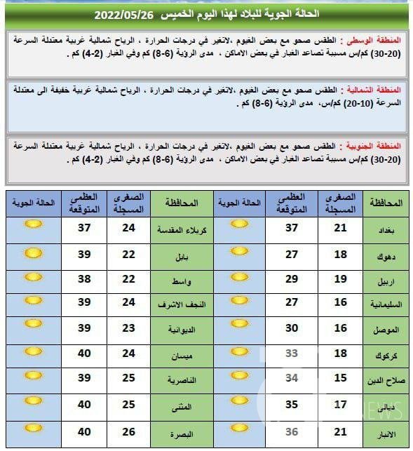 وذكرت الهيئة أن درجات الحرارة تلامس الـ40 درجة في البصرة والمثنى وميسان، فيما أشارت إلى أن المناطق الجنوبية والوسطى تشهد تصاعدا للغبار في بعض الأماكن جراء الرياح الشمالية الغربية.