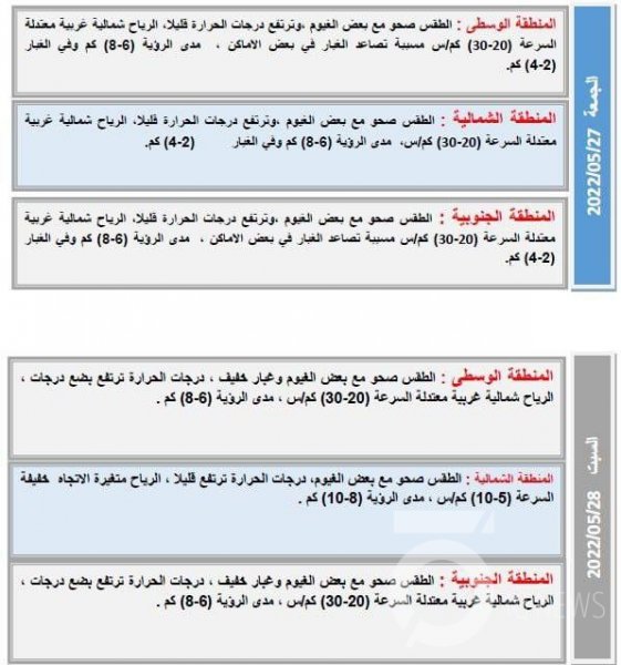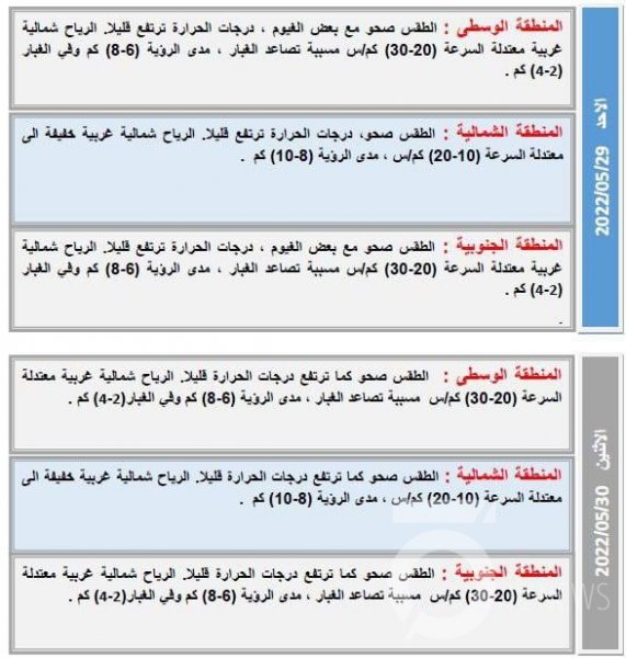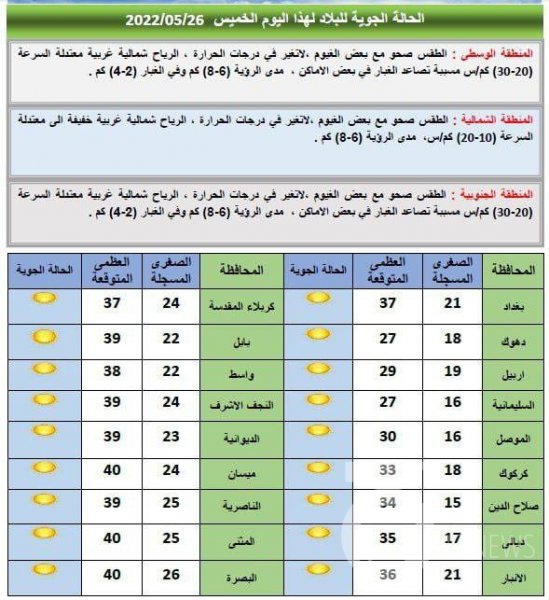 توقعت هيئة الأنواء الجوية والرصد الزلزالي، حالة الطقس لليوم الخميس (26 أيار 2022) والأيام الأربعة المقبلة.