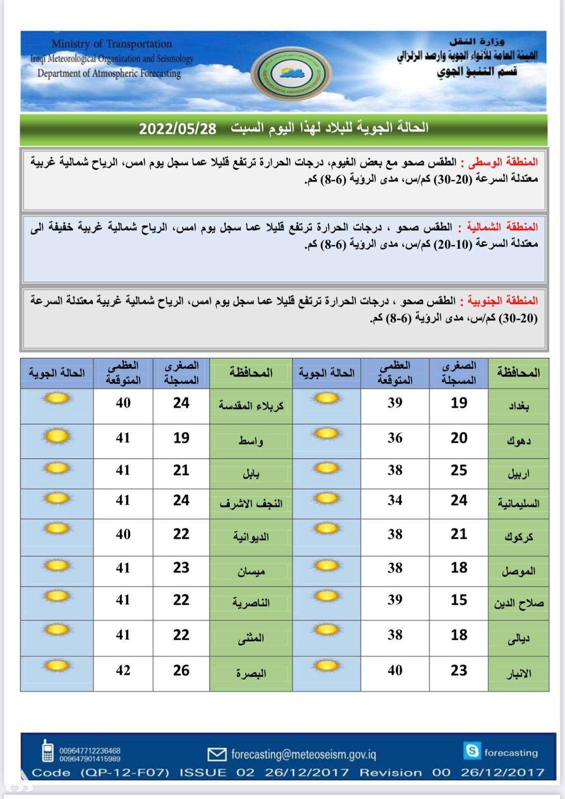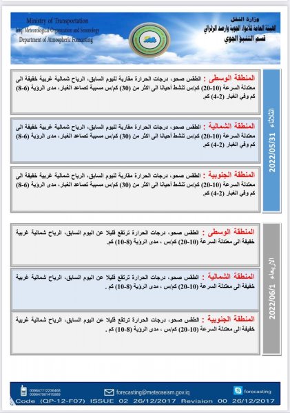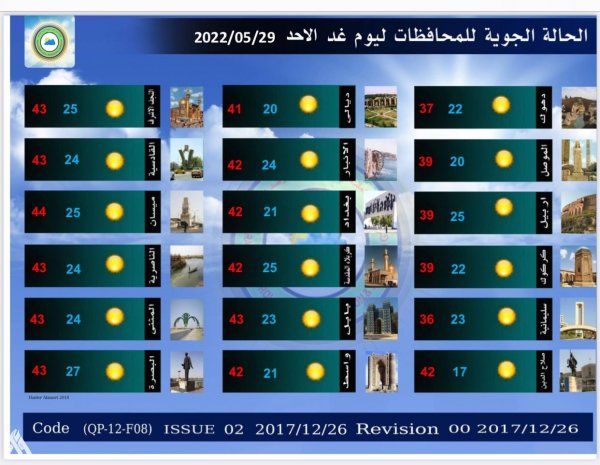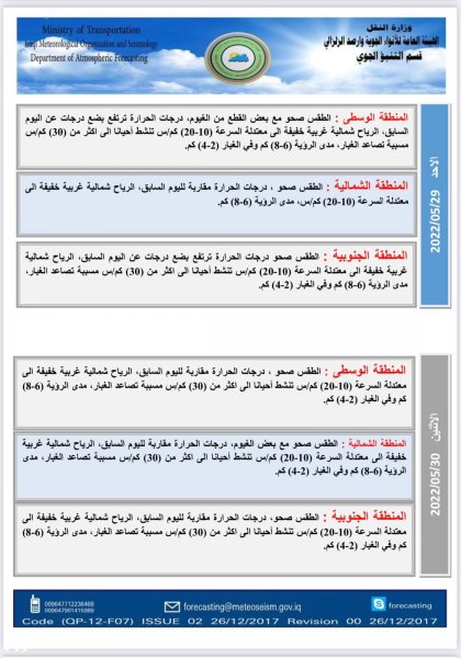 أعلنت هيئة الأنواء الجوية، اليوم السبت، عن حالة الطقس في البلاد للأيام المقبلة، فيما توقعت تصاعداً للغبار وارتفاعاً في درجات الحرارة.