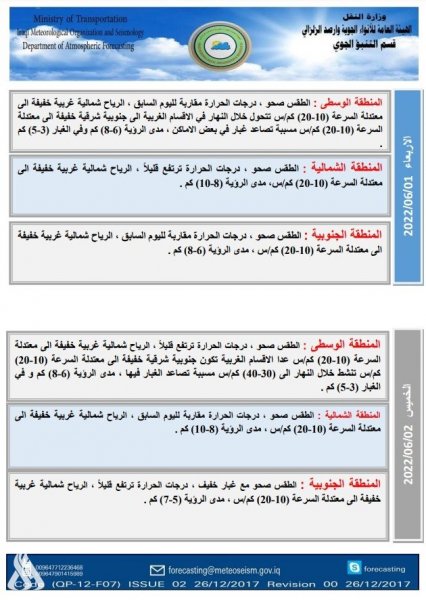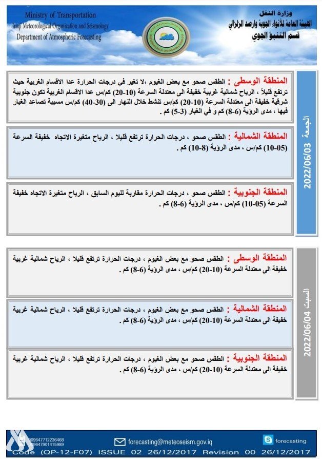 أعلنت هيئة الأنواء الجوية، اليوم الثلاثاء، عن حالة الطقس في العراق للأيام المقبلة، فيما توقعت استمرار تصاعد الغبار إلى نهاية الأسبوع.