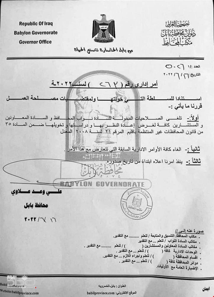 وبحسب الوثيقة، فأن "محافظ بابل علي وعد علاوي اصدر امراً بالغاء كافة الصلاحيات الممنوحة لنائبيه، فضلا عن الصلاحيات الممنوحه للمستشارين".