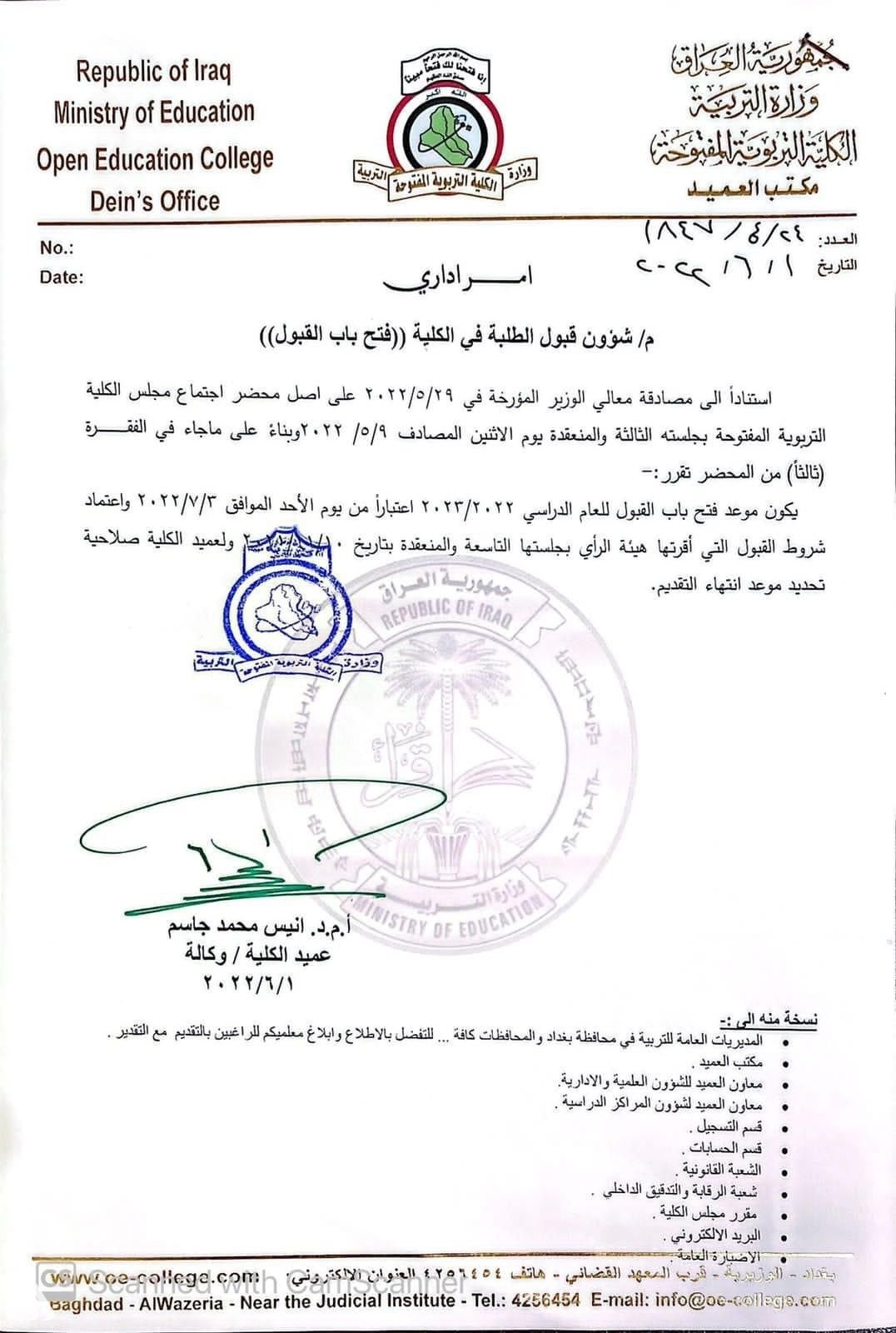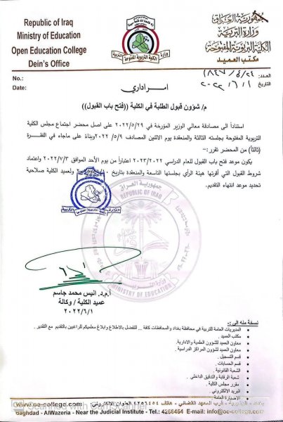 أعلنت وزارة التربية، اليوم الثلاثاء، عن فتح باب التقديم للراغبين بالدراسة في الكلية التربوية المفتوحة في جميع مراكزها للعام الدراسي (2022-2023)، فيما نوهت الى ان موعد انتهاء التقديم يُحدد من قبل عميد الكلية.
