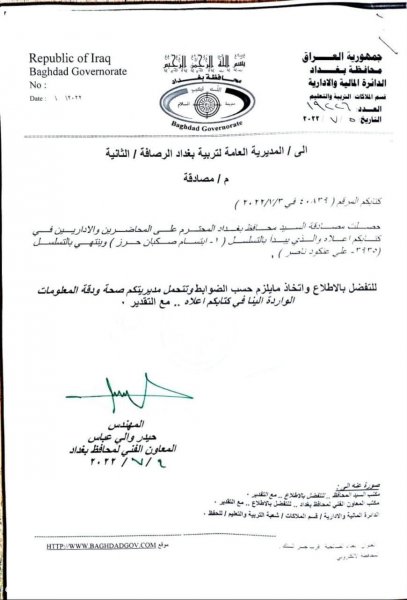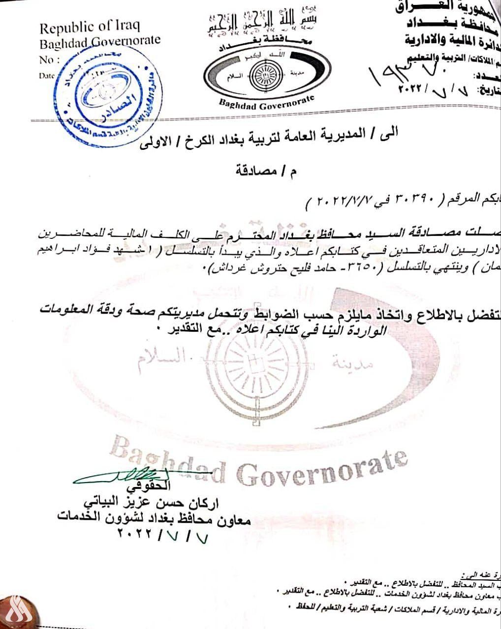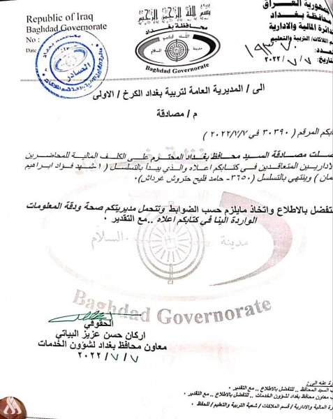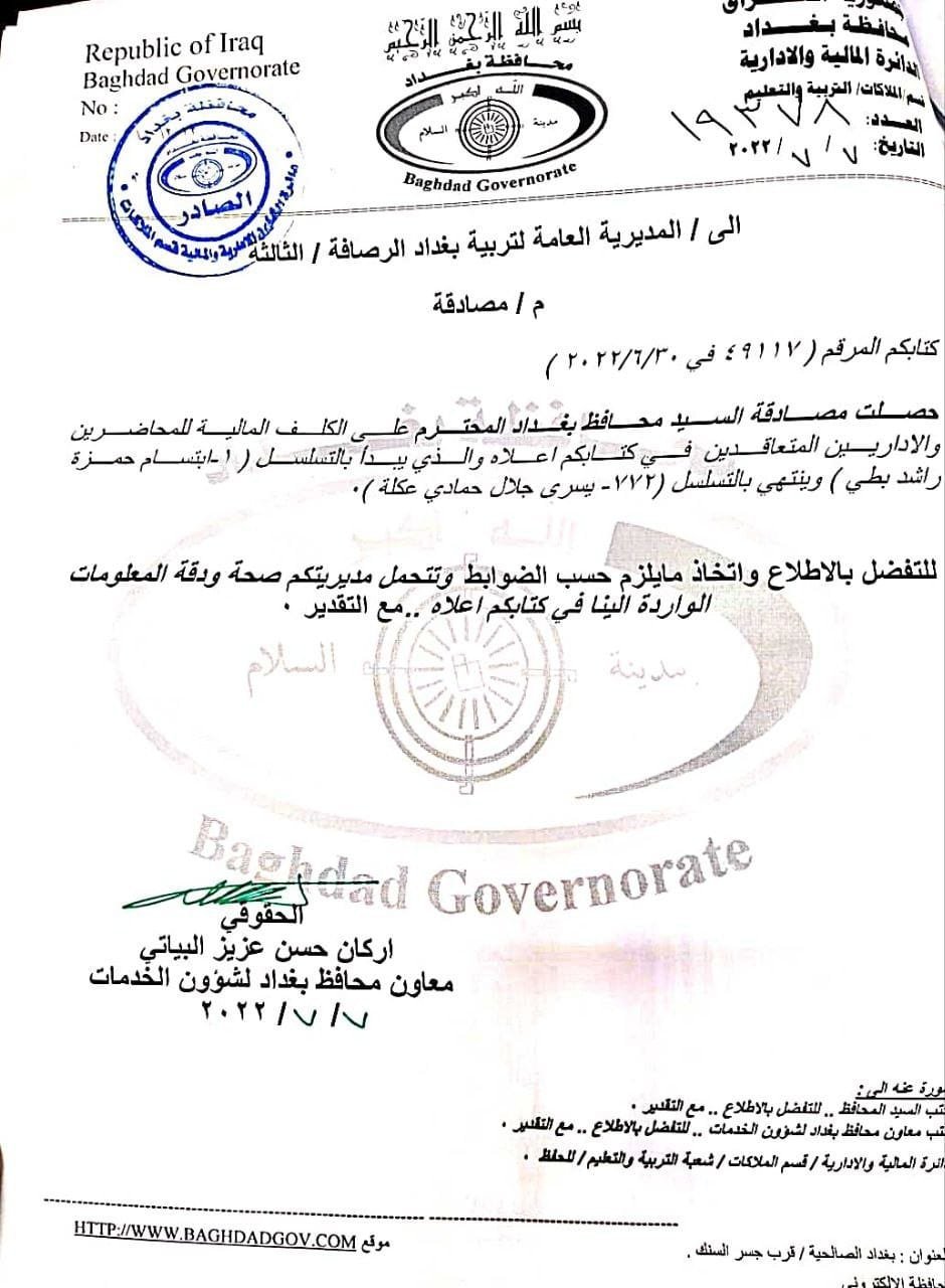 صادق محافظ بغداد محمد جابر العطا، اليوم الجمعة، على محاضر كُلف تحويل المحاضرين والإداريين المُعينين بصفة عقد ضمن قرار (١٣٠ لسنة ٢٠٢١).