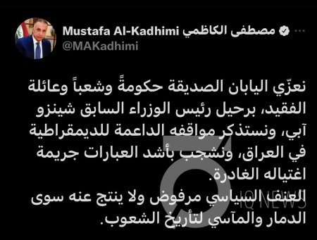 وكتب الكاظمي في تغريدة له، : "نعزّي اليابان الصديقة حكومةً وشعباً وعائلة الفقيد، برحيل رئيس الوزراء السابق شينزو آبي، ونستذكر مواقفه الداعمة للديمقراطية في العراق، ونشجب بأشد العبارات جريمة اغتياله الغادرة".