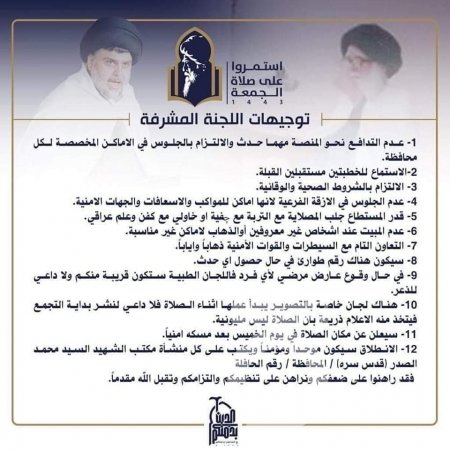 أصدرت اللجنة المشرفة على صلاة الجمعة الموحدة في مدينة الصدر، التي دعا لها زعيم التيار الصدري، مقتدى الصدر، توجيهات جديدة الثلاثاء (12 تموز 2022).