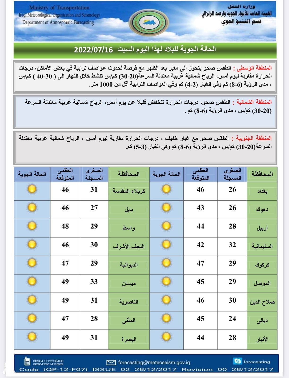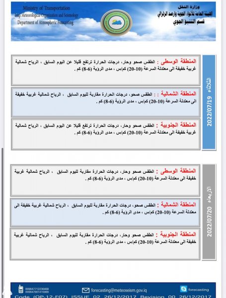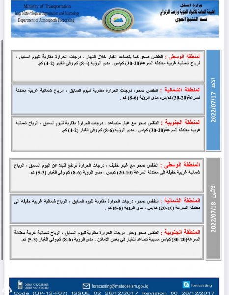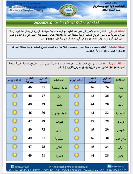 أعلنت هيئة الأنواء الجوية، اليوم السبت، عن حالة الطقس في البلاد للأيام المقبلة، فيما توقعت ارتفاعاً في درجات الحرارة.