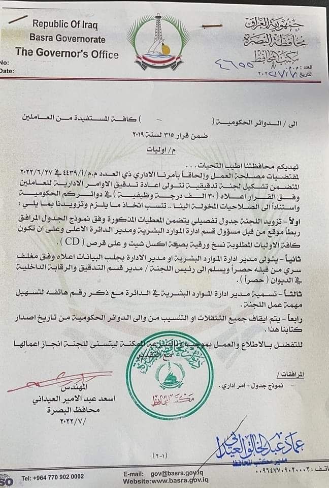 محافظ البصرة يشكل لجنة تدقيقية بأوليات المشمولين بالقرار 315