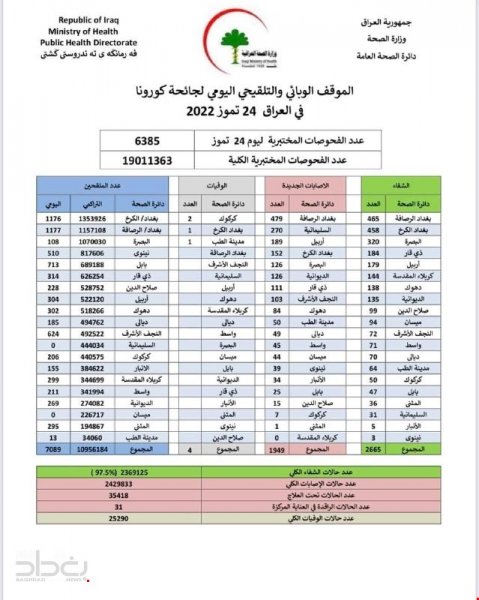 أعلنت وزارة الصحة، اليوم الأحد، الموقف الوبائي اليومي لجائحة كورونا في عموم البلاد.