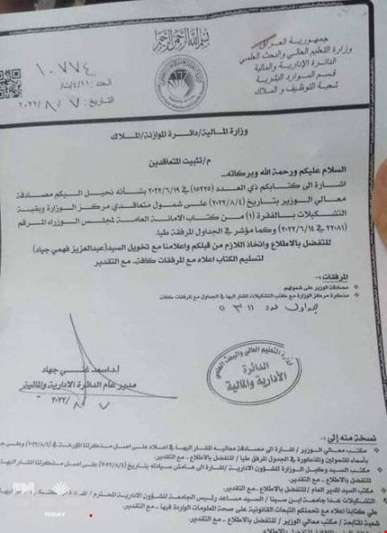خاطبت وزارة التعليم العالي وزارة المالية بشأن تثبيت عقود مركز الوزارة وبقية التشكيلات.