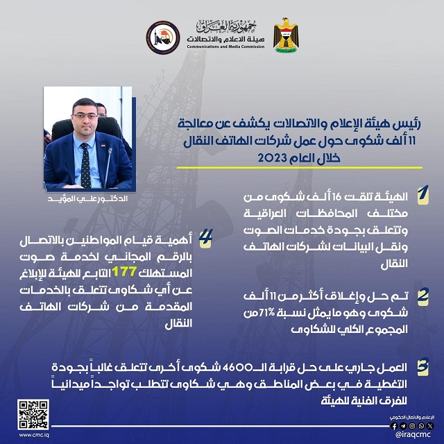 وأشار الى أنه "تم خلال الـ9 أشهر الماضية من هذا العام 2023 تلقي قرابة الـ16 ألف شكوى من مختلف المحافظات العراقية تتعلق بجودة خدمات الصوت ونقل البيانات المقدمة من قبل شركات الهاتف النقال".