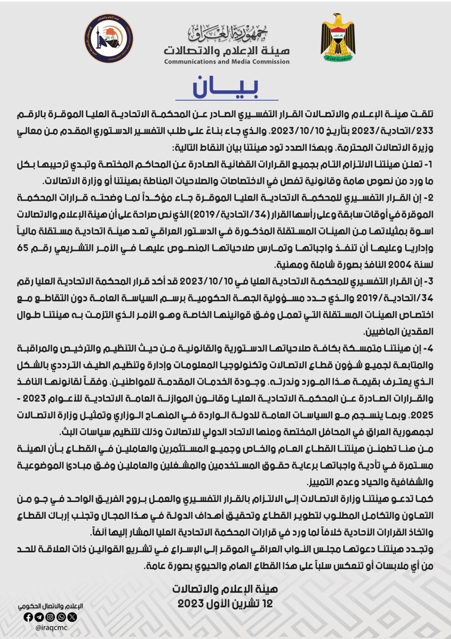 وذكرت الهيئة، في بيان أن "هيئة الإعلام والاتصالات تلقت القرار التفسيري الصادر عن المحكمة الاتحادية العليا الموقرة بالرقم 233/اتحادية/2023 بتأريخ 10/10/2023، والذي جاء بناءً على طلب التفسير الدستوري المقدم من معالي وزيرة الاتصالات المحترمة، وبهذا الصدد تود هيئتنا بيان النقاط التالية: