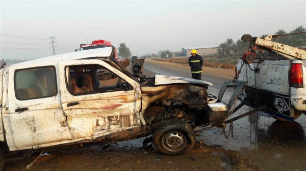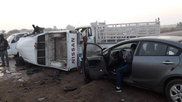 واضاف انه "على الفور خرجت مفرزة من مركز دفاع مدني المحاويل وحين الوصول للحادث تبين اصطدام 3 عجلات واحتراق أحد العجلات نوع