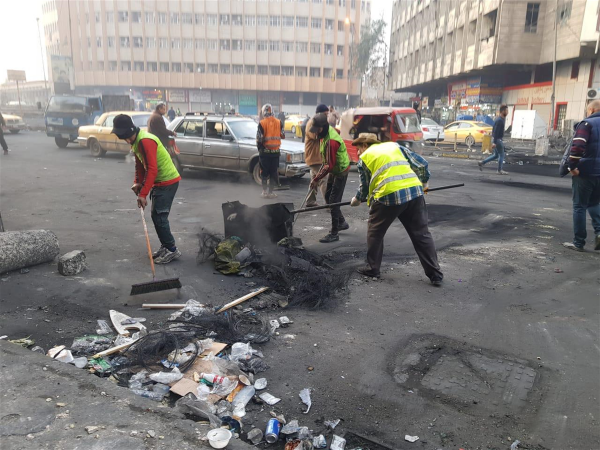 وقالت الامانة في بيان ان "كوادر امانة بغداد باشرت صباح اليوم الخميس بحملة لتنظيف وغسل ساحتي التحرير والوثبة ومنطقة حافظ القاضي وسط بغداد".
