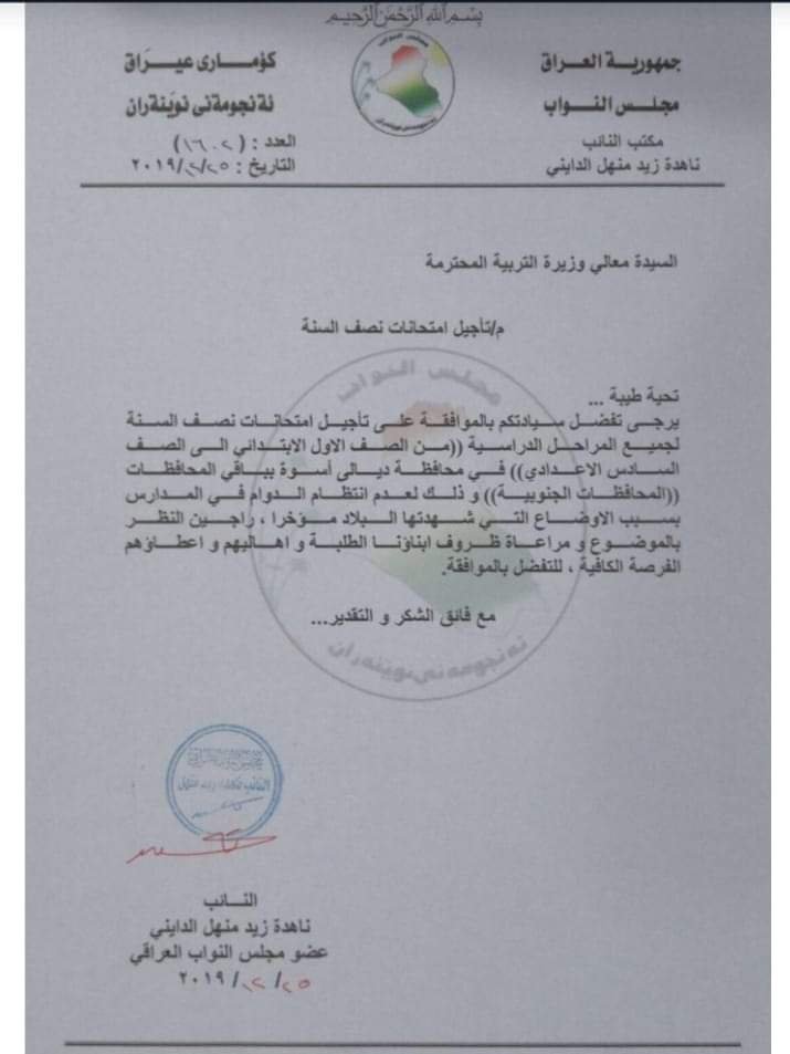 تنشر وكالة من كربلاء الخبر وثيقة باسم النائب ناهدة زياد منهل تتضمن مطالبة بتأجيل امتحانات نصف السنة في ديالى اسوة بالمحافظات الجنوبية.