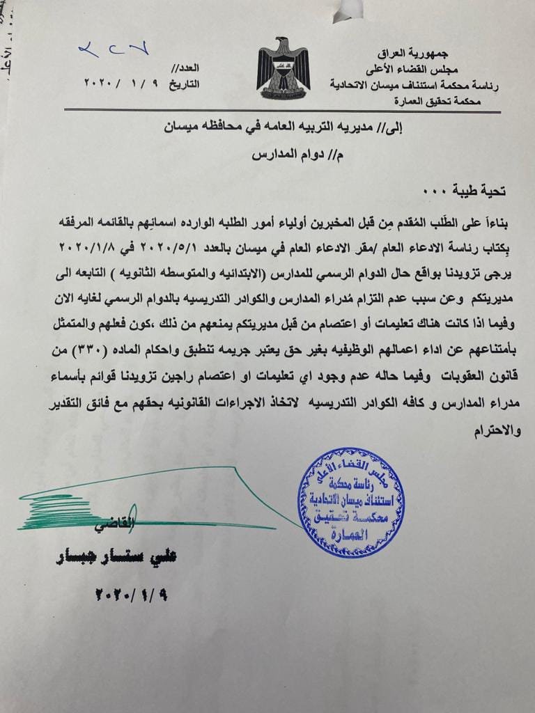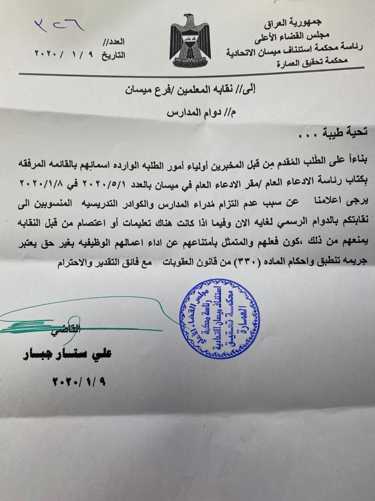 تنشر وكالة من كربلاء الخبر وثائق تتضمن مخاطبة محكمة تحقيق العمارة لتربية ونقابة المعلمين في ميسان بشأن دوام المدارس.