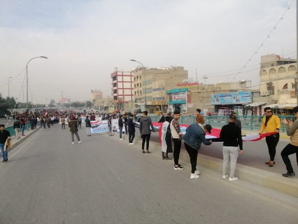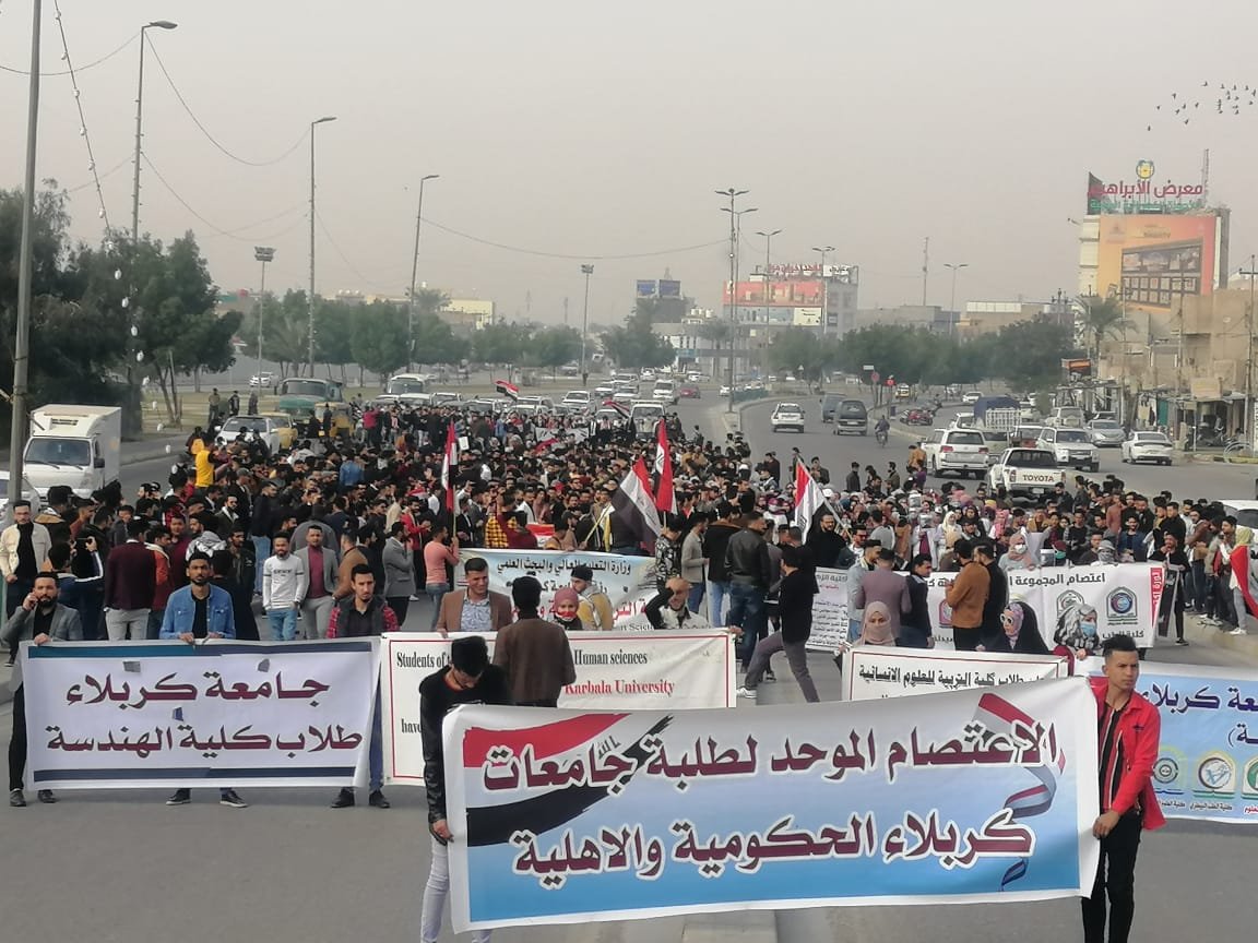 نظم الطلبة الجامعيون من مختلف الكليات (الحكومية، الاهلية) في محافظة كربلاء، اليوم الاحد، اعتصاما موحدا تضامنا مع التظاهرات الاحتجاجية التي تشهدها بغداد وعدد من المحافظات.