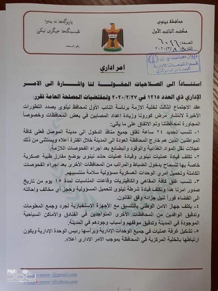 عقدت خلية الأزمة في محافظة نينوى، برئاسة المحافظ نجم الجبوري، اجتماعا بصدد تطورات انتشار فيروس كورونا، فيما أصدرت 8 توجيهات، من بينها غلق منافذ الدخول الى المحافظة، خلال 24 ساعة.وتضمنت قرارات الخلية، تحديد 24 ساعة لغلق جميع منافذ الدخول الى مدينة الموصل.