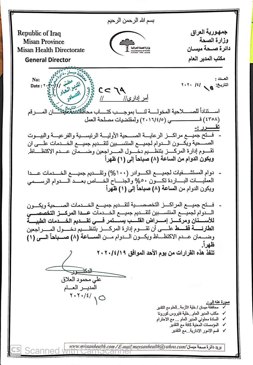 تنشر وكالة من كربلاء الخبر بالوثيقة، القرارات التي اتخذتها دائرة صحة محافظة ميسان نتيجة لمستجدات الموقف الوبائي لفيروس كورونا.