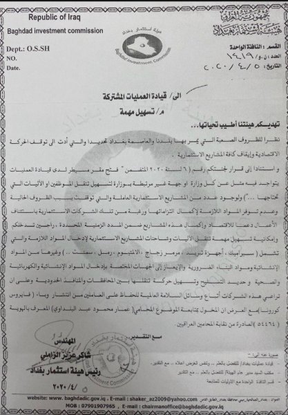 كشفت وثيقة صادرة من هيئة استثمار بغداد، موجهة إلى قيادة العمليات المشتركة، تطالب فيها بتسهيل مهمة تنقل الشاحنات المحملة بالمواد الإنشائية.  وبحسب الوثيقة التي حصلت "من كربلاء الخبر " عليها أن "الطلب جاء لغرض استئناف الشركات الاستثمارية أعمالها في المشاريع، دعماً للاقتصاد ضمن التوقيتات الزمنية المحددة".من جانبه، أكد مصدر في قيادة عمليات بغداد لـ"الغد برس" إن "قيادة العمليات المشتركة، أبلغت الهيئة بأن قرارات خلية الأزمة واضحة وصريحة، فيما يخص الاستثناءات من فرض حظر التجوال، ولا يمكن مخالفة التوجيهات الصادرة بهذا الشأن"