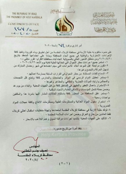 تنشر من كربلاء الخبر مجموعة من القرارات التي اصدرتها خلية الازمة في كربلاء برئاسة المحافظ كربلاء نصيف جاسم الخطابي
