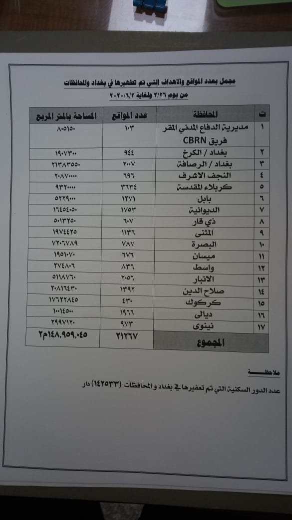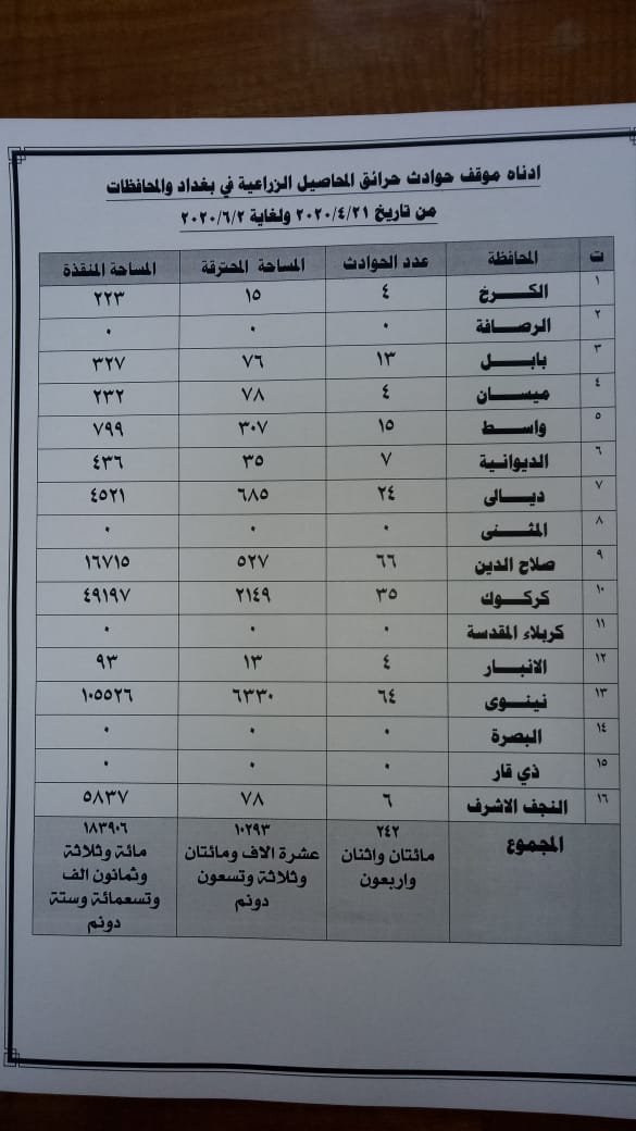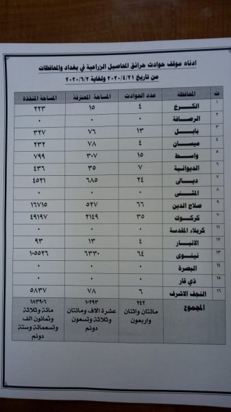 اعلنت مديرية الدفاع المدني، الثلاثاء، عن موقف حوادث حرائق المحاصيل الزراعية في بغداد والمحافظات لمدة 43 يوما.