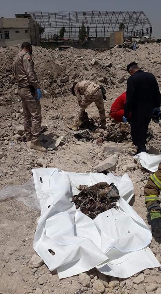 وأضافت أن "الجهد الهندسي لقيادة عمليات نينوى شرع برفع المقذوفات والمخلفات الحربية لعصابات داعش الاجرامية وأثناء عمليات رفع الأنقاض من المدينة القديمة تم العثور جثث عدد اثنين مجهولة الهوية كانت ( بقايا هياكل عظمية) "، مبينة أن "فرق الدفاع المدني باشرت برفعها وتسليمها إلى دائرة الطب العدلي وفق الاجراءات القانونية المتبعة