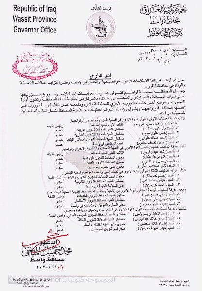 أعلن رئيس خلية الأزمة محافظ واسط محمد جميل المياحي، اليوم الإثنين، عن تشكيل خمس غرف عمليات إضافة إلى مركز المحافظة تتوزع مسؤولياتها على نواب المحافظ ومعاونوه ومستشاروه لمتابعة وتسهيل عمل خلايا الأزمة الصحية، وتنشر وكالة من كربلاء الخبر نسخة من الوثيقة ذات الصلة.