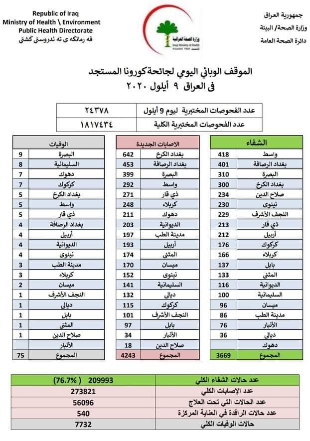 أعلنت وزارة الصحة العراقية ، الاربعاء 9 ايلول 2020، تسجيل 75 حالة وفاة و4243 إصابة جديدة بفيروس كورونا قابلتها 3669 حالة شفاء.