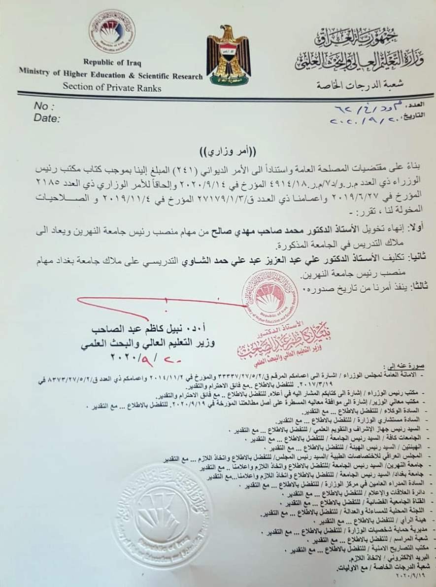 وقالت الوزارة في بيان ان "وزير التعليم العالي والبحث العلمي نبيل كاظم عبد الصاحب كلف علي الشاوي رئيسا لجامعة النهرين".