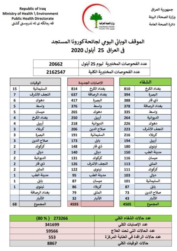اعلنت وزارة الصحة، الجمعة، تسجيل 4593 اصابة جديدة بفيروس كورونا خلال الـ24 ساعة في عموم العراق، مشيرة الى تماثل 4505 حالات للشفاء من الفيروس.