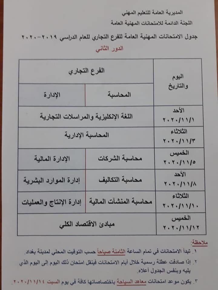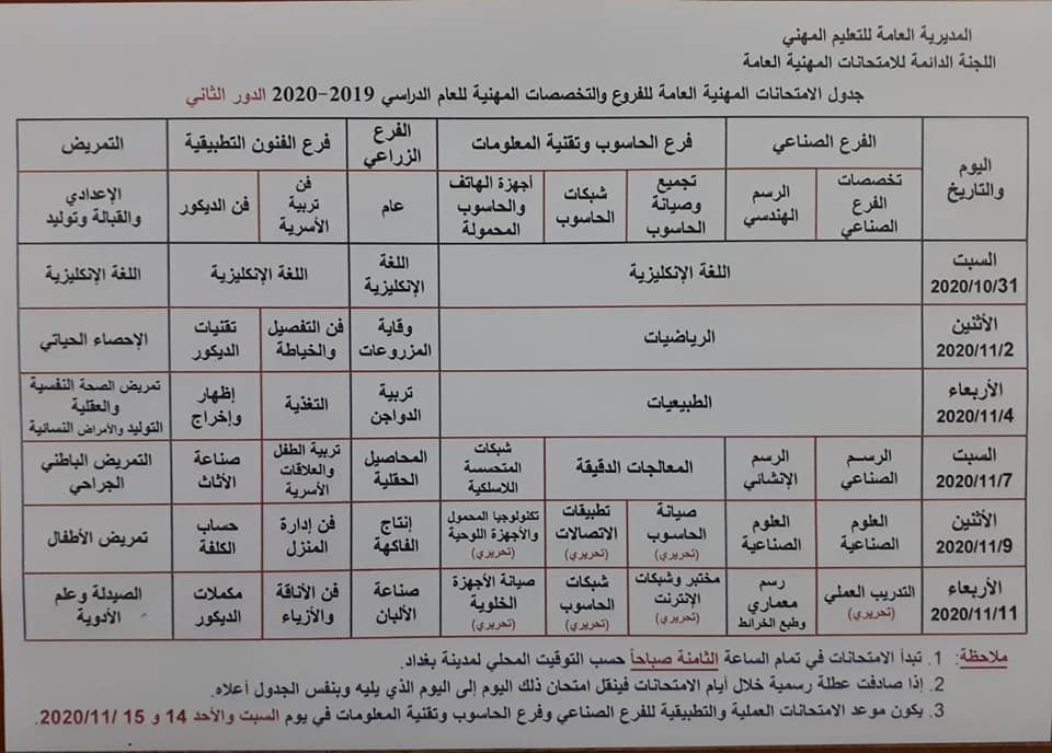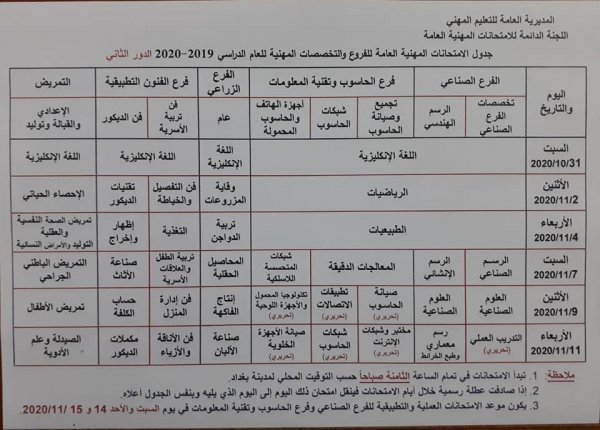 وقالت وزارة التربية في بيان لها، "جدول الامتحانات العامة / الدور الثاني للتعليم المهني ولكافة الفروع والتخصصات ( الصناعي، التجاري، الفنون التطبيقية، الزراعي، فرع الحسوب وتقنية المعلومات ، التمريض ) للعام الدراسي 2019-2020 .".