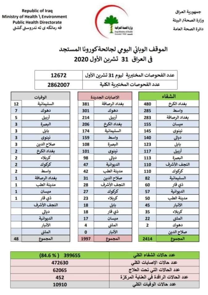 كما تم تسجيل 48 حالة وفاة جديدة بكورونا في العراق.