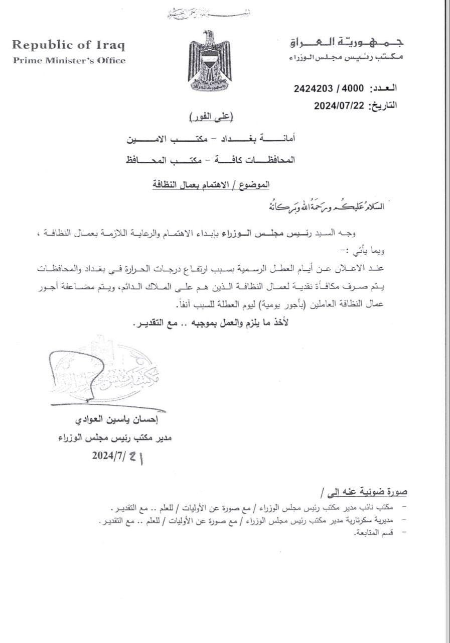 رئيس الوزراء يوجه بصرف مكافأة نقدية لعمال النظافة ورفع أجور العاملين اليوميين خلال أيام العطل الرسمية بسبب ارتفاع درجات الحرارة