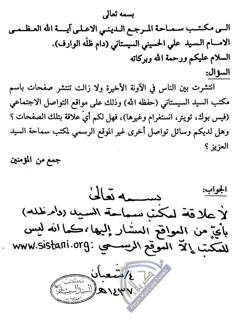 جواب مكتب المرجع الاعلى السيد السيستاني :بشأن سؤال حوال وجود صفحة رسمية للمكتب في مواقع التواصل الاجتماعي