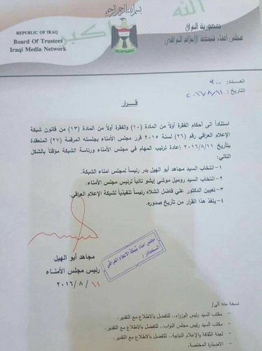 بالوثيقة.. علي الشلاه رئيسا لشبكة الاعلام العراقي