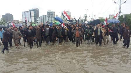 بالصور ..رغم الامطار الغزيرة الالاف يتظاهرون تاييدا لاعتصام الصدر