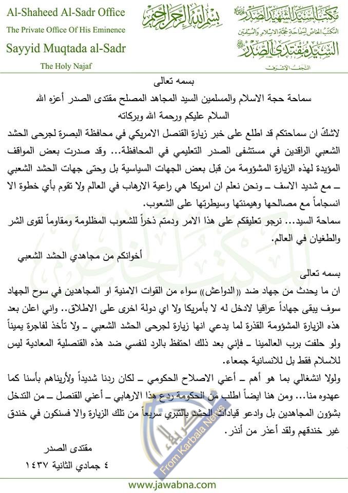 الصدر يصف القنصل الامريكي بالإرهابي ويدعو الى التبرئ من زيارته ومنعه من التدخل في شؤون المجاهدين