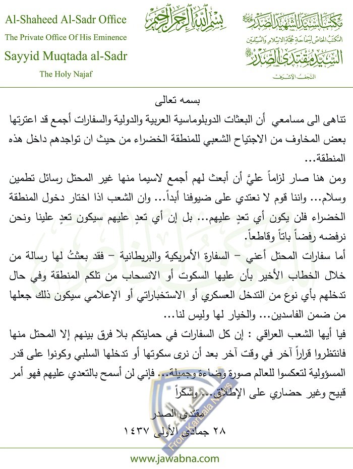 السيد الصدر : جميع السفارات بأمان وسلام الا سفارات المحتل فعليها الاختيار بين الصمت او الرحيل