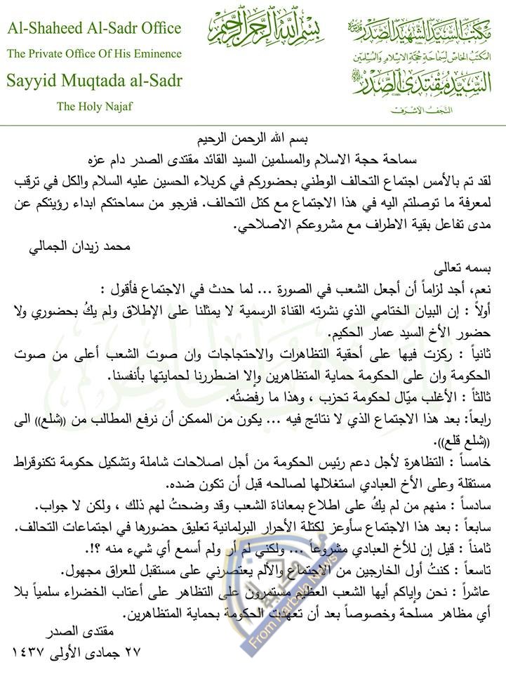 السيد الصدر : التظاهرات لدعم رئيس الحكومة من اجل تشكيل وزراء كفاءات وعليه استغلالها قبل ان تتحول ضده