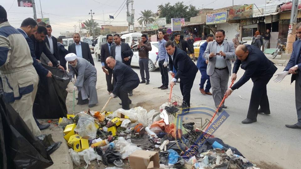 حملة لتنظيف شوارع كربلاء بمشاركة ممثل المرجعية والمحافظ ووزير الاعمار