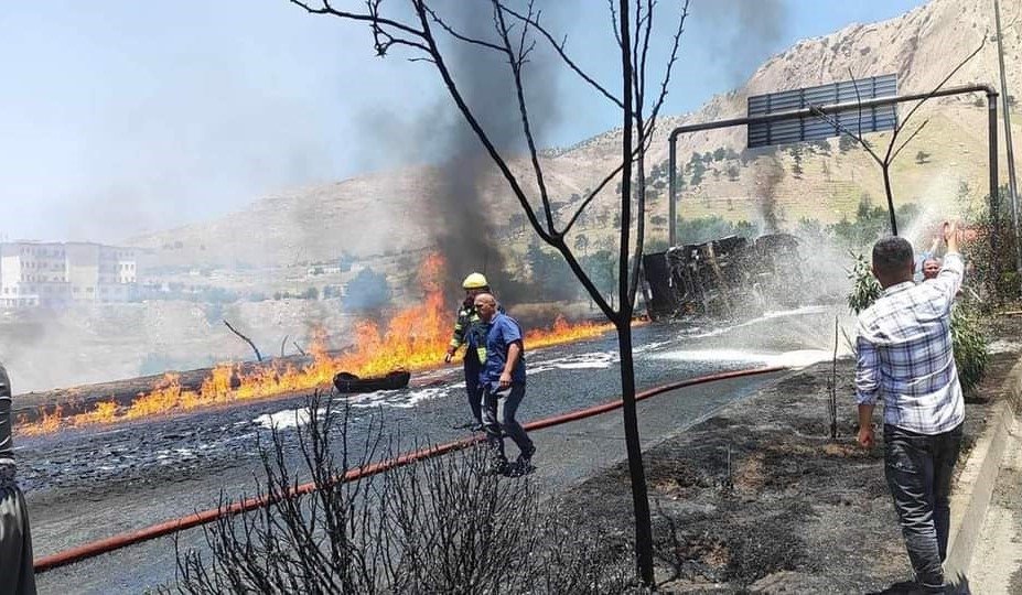 حريق يلتهم شاحنة وقود ويتسبب بقطع طريق السليمانية - دربنديخان