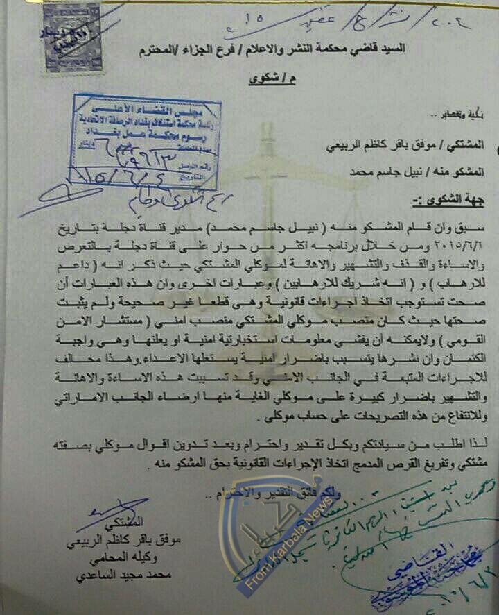 وكالة من كربلاء الخبر تنشر وثيقة شكوى موفق الربيعي على الاعلامي د.نبيل جاسم