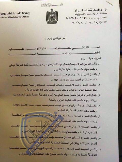 العبادي يصدر أمراً ديوانياً بنقل واستبدال 12 قائداً عسكرياً